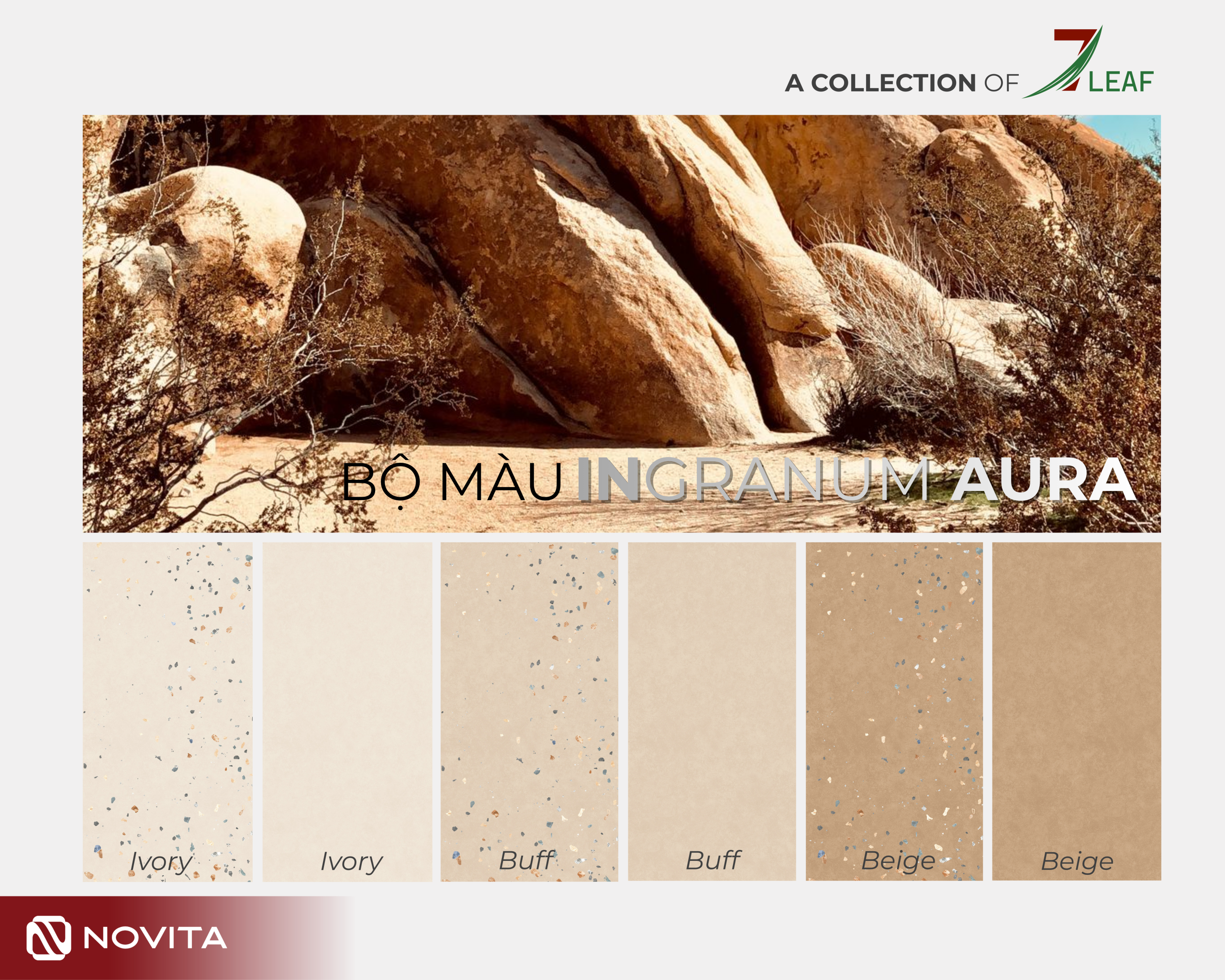 - Bộ màu Ingranum Aura – Ánh sáng của sự khởi đầu: Gợi nhắc khoảnh khắc bình minh vừa chạm vào những vách đá vôi vùng Lombardia (Ý). SEVENLEAF đã bắt lấy cái “thần” của nắng sớm, của cát mịn và sự tinh khôi để đưa vào không gian nội thất. Những tông màu Ivory, màu Buff hay màu Beige mang lại sự ấm áp và nhẹ nhàng, lý tưởng cho những không gian cần sự thoáng đạt và thư thái.