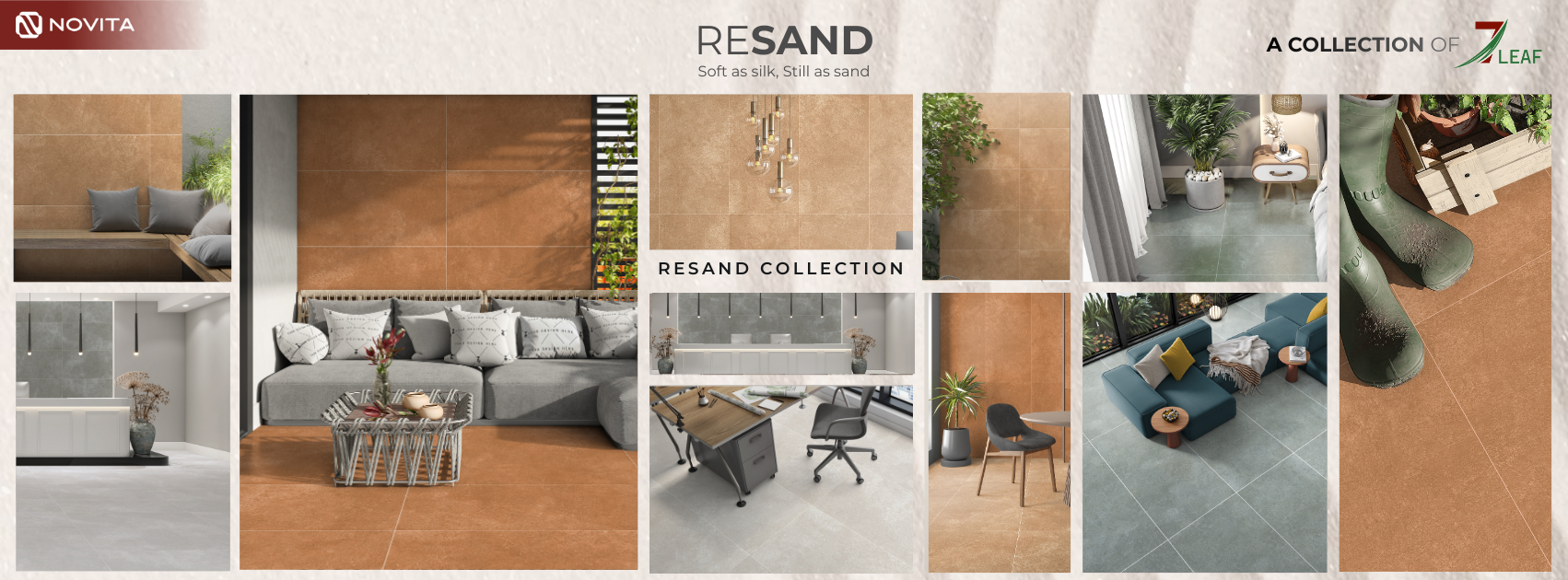 Resonating perfectly with the refined desire for a living space that is “Serene as a leaf,” and inspired by the philosophy of “La Dolce Vita” (The Sweet Life), the SEVENLEAF brand (part of the NOVITA ecosystem) has curated the RESAND collection. Breathing soul into the inherently silent tile, the RESAND collection emerges as a captivating, living entity: “Soft as silk” to soothe the vision, yet “Still as sand” to anchor serenity. Thus, RESAND officially unveils a new design philosophy: where the steadfastness of earth and the fluidity of silk walk side by side to craft a distinct lifestyle.